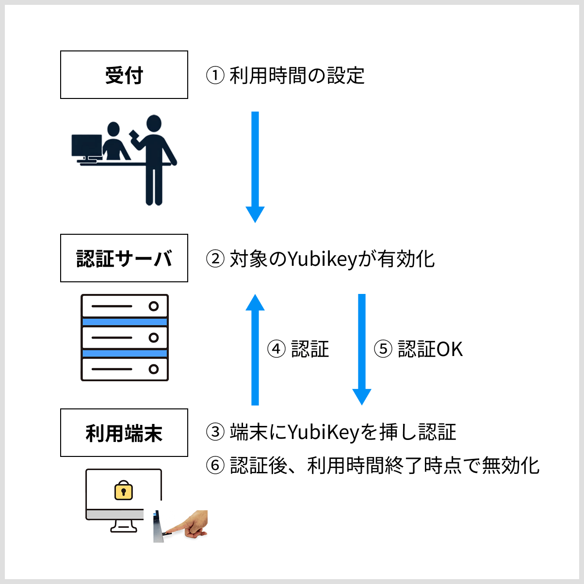 利用者は、受付で身分証を提示してYubiKeyを受け取ります。