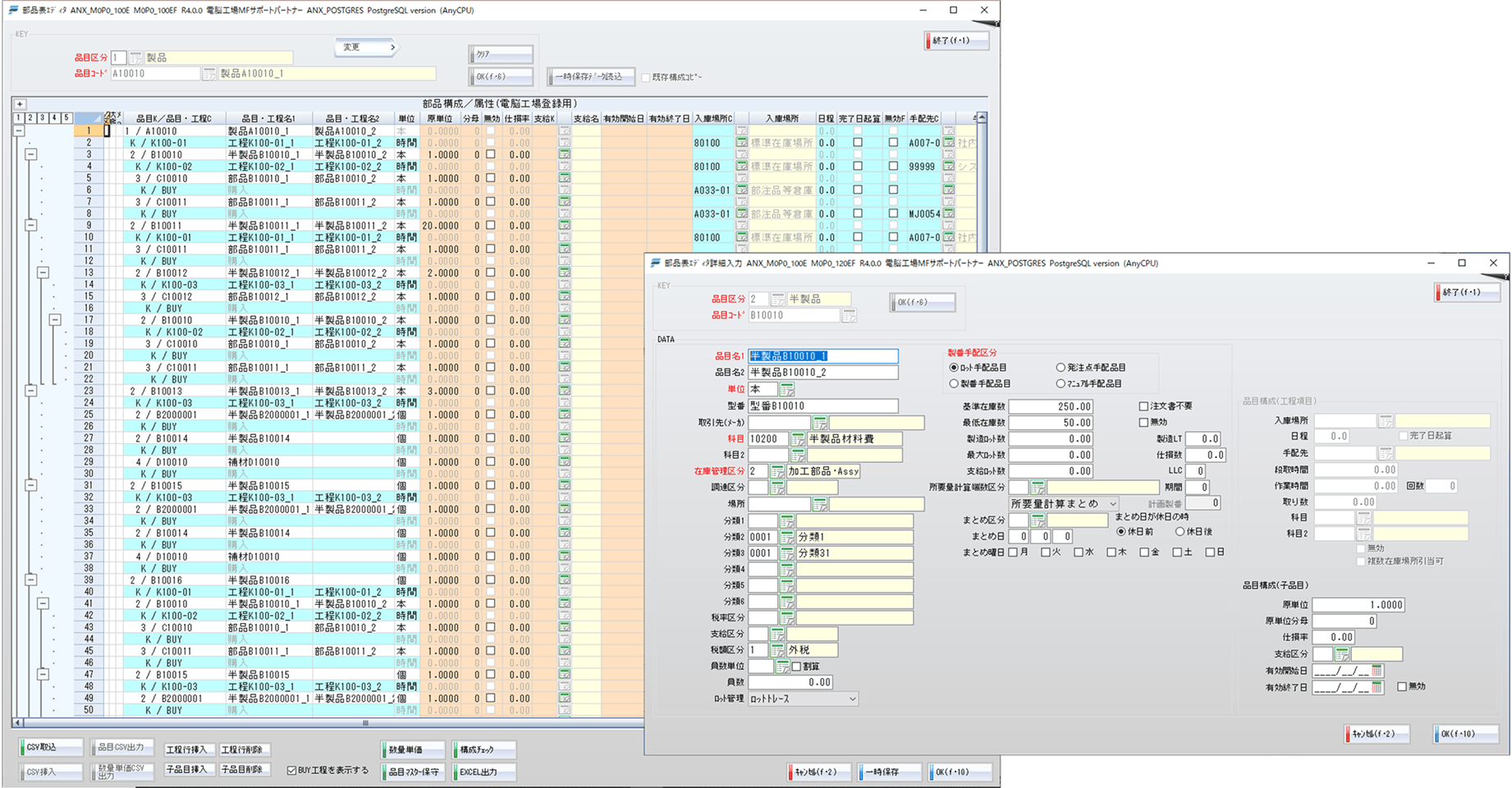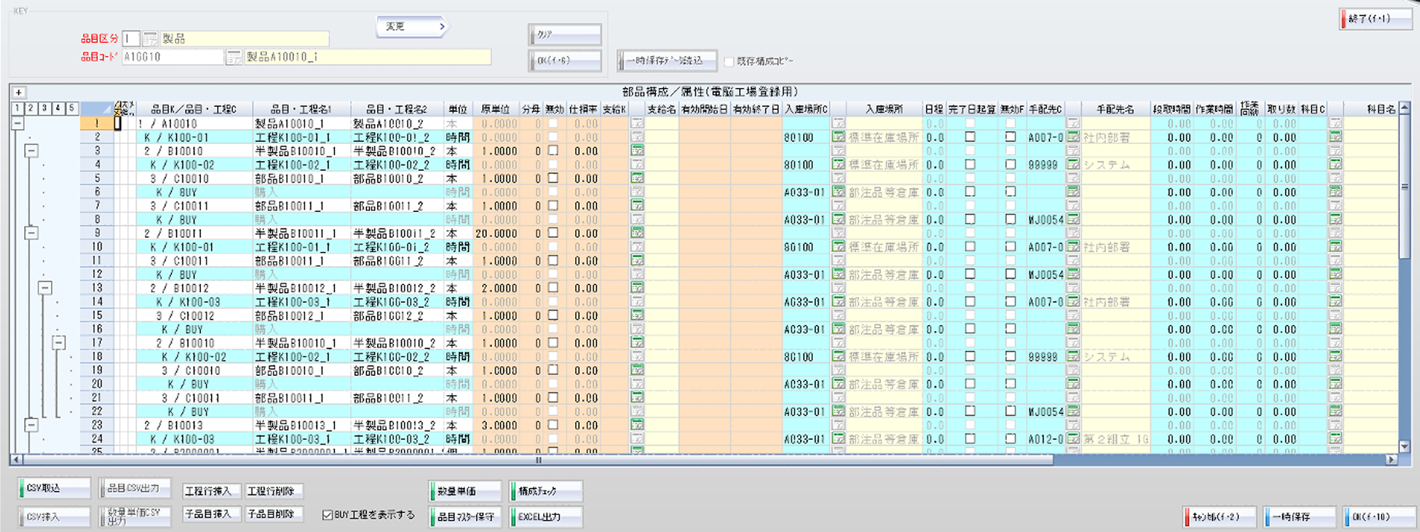 - 電脳工場の品目マスター、品目構成マスターを一画面で一元管理。 M-BOMの編集・登録が一覧表形式で可能