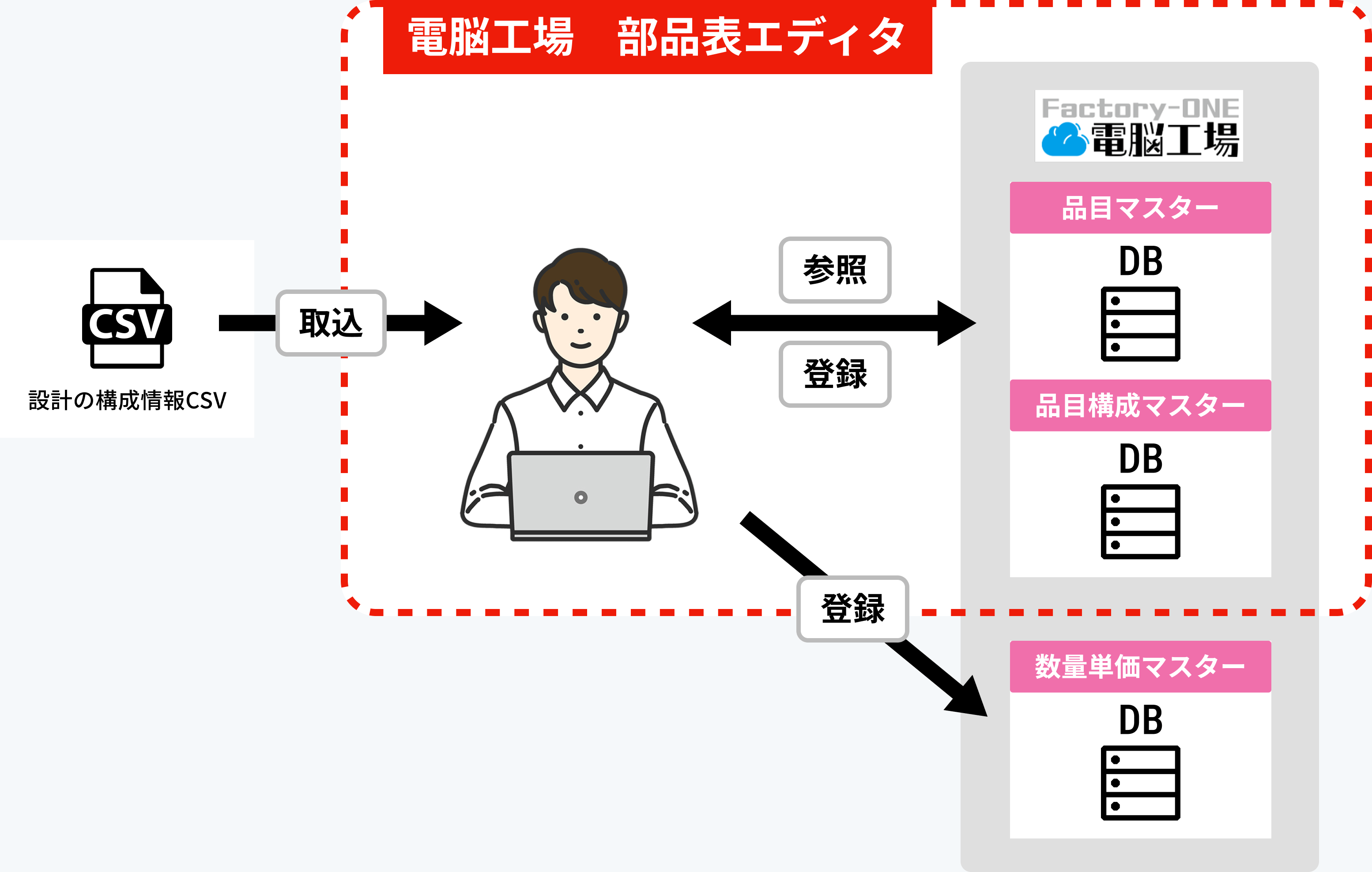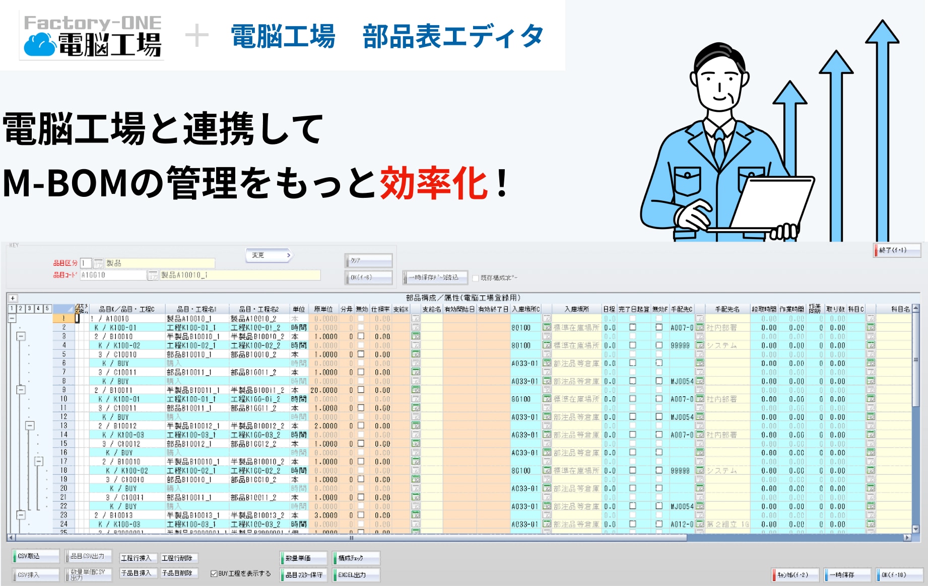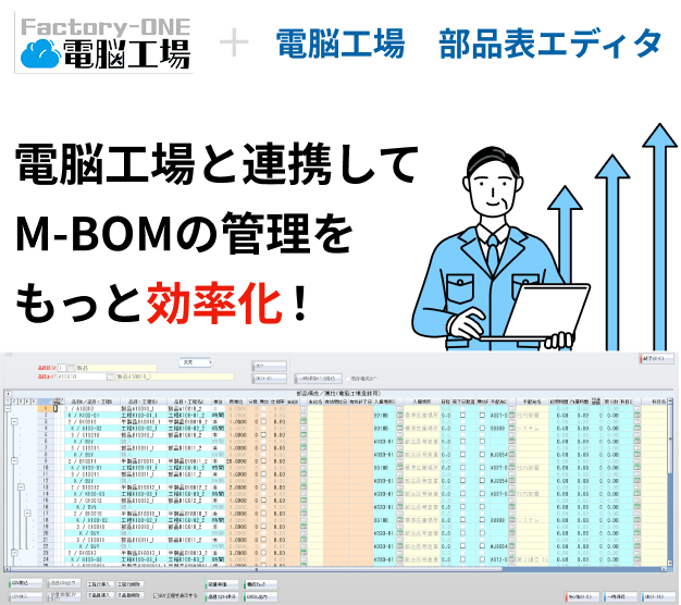 「Factory-ONE電脳工場」と連携してM-BOMの管理を効率化できる部品表エディタです。