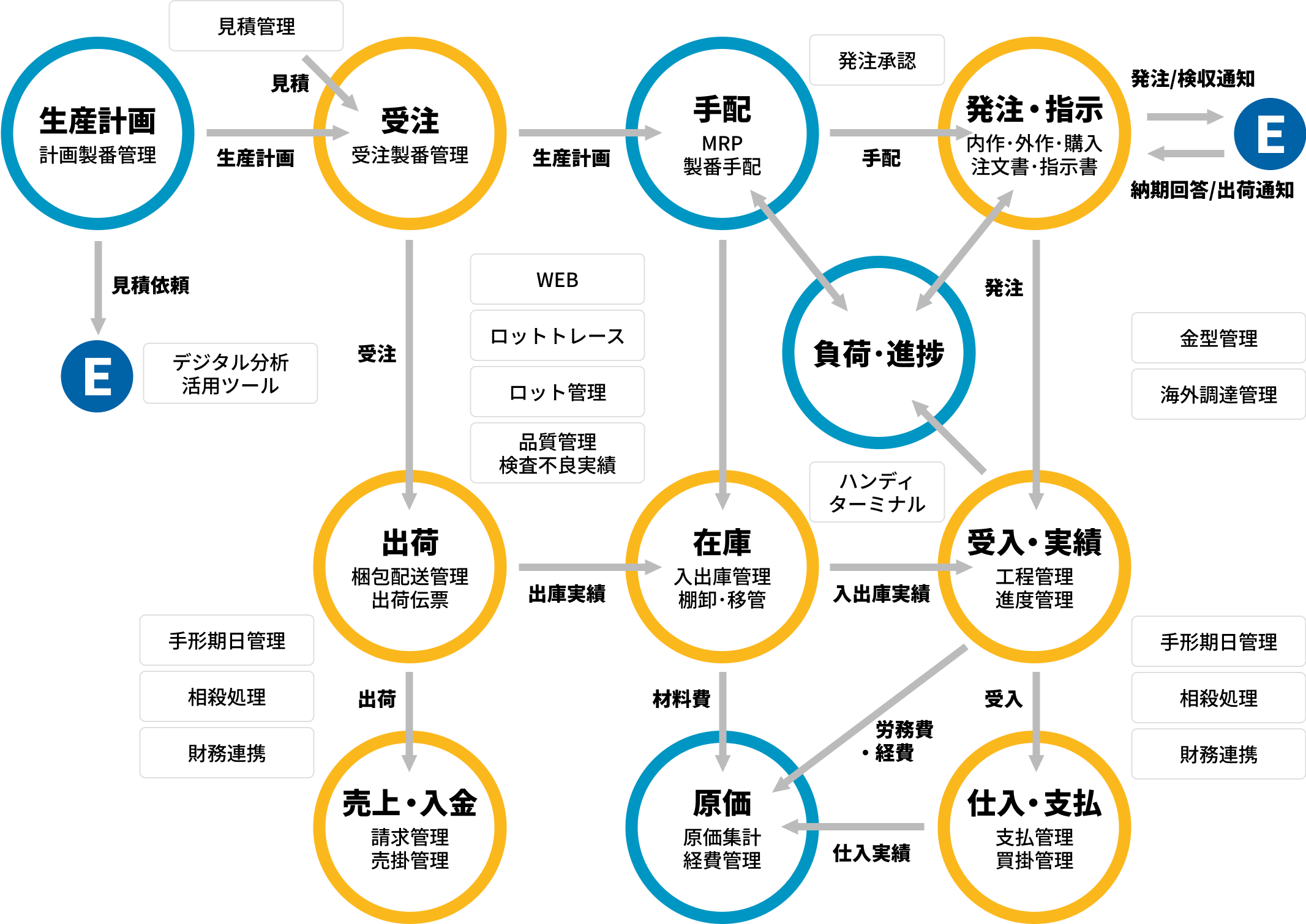 販売開始から約30年。2000本を超える導入実績。生産計画の立案から受注・出荷・手配計画(MRP手配or製番手配)・発注・受入・在庫・負荷・進捗・原価に至るものづくり情報を総合的に管理し、工場経営を強力に支援します。生産管理システムでありながら、請求・売掛・入金・仕入・買掛・支払など販売管理機能も標準装備した生販一体型のシステムです。